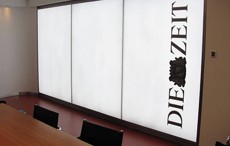 Mit dieser Anfrage wandte sich der ZEIT-Verlag an Schreib+Keppler, die schon einige Leuchtschriften für die Außenfassade des Verlags geliefert hatten. Das ca. 10 m² Leuchtobjekt sollte zwar in die Wand eingelassen werden,dennoch musste die Konstruktion seitlichem Druck, z.B. durch eine sich anlehnende Person, standhalten. Zudem wünschten sich die Bauherren unterschiedliche Lichtsituationen (Dimmbarkeit, Farbwechsel zwischen weiß und blau) sowie die Steuerung des Lichtspiels über ein so genanntes Touchscreen. Auch bei ausgeschaltetem Zustand sollte sich die Wand in die hochwertige Einrichtung des Raums integrieren und jederzeit den Eindruck eines Lichtkunstobjektes verbreiten.