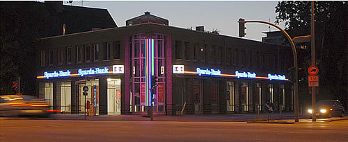 Leuchtbuchstaben so flach wie eine Zigarettenschachtel setzen die Sparda-Bank Hamburg edel in Szene
